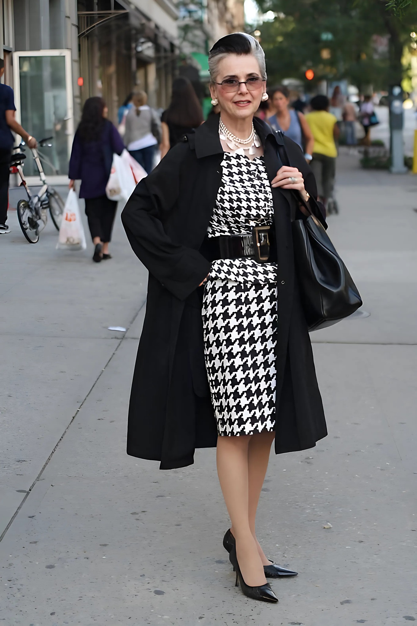 - Un costume sobre avec un motif « patte d’oie ».