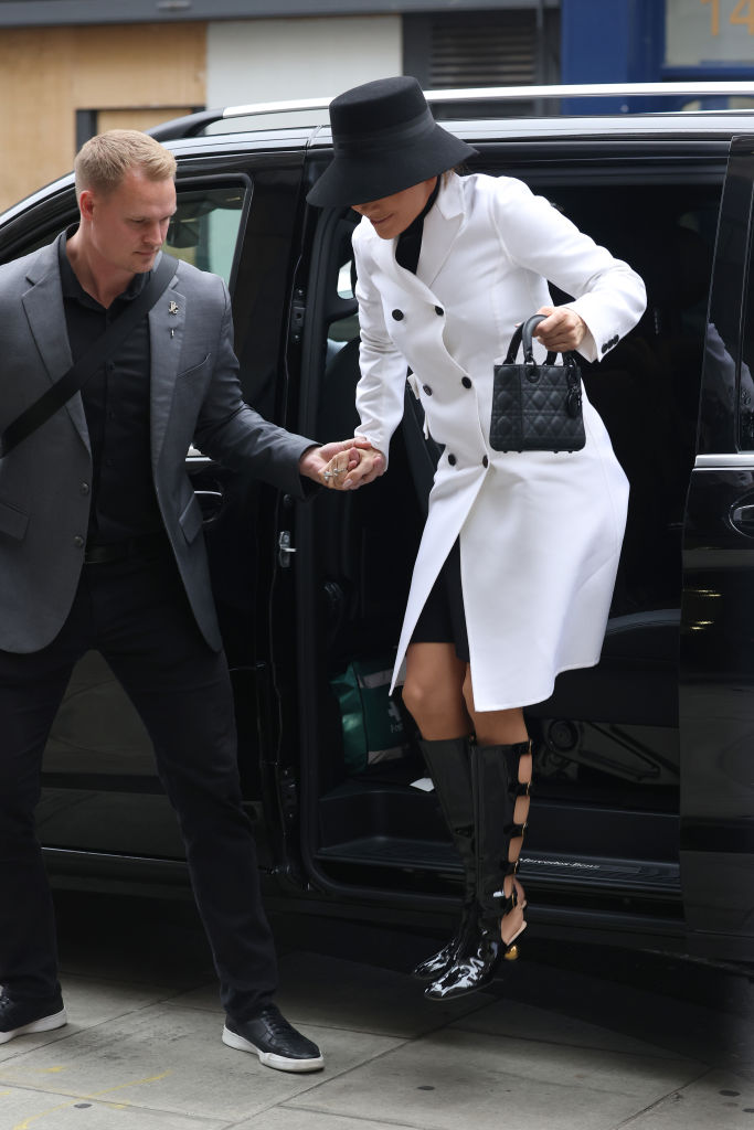 La star de 55 ans souriait en tenant le bras de son garde du corps à l’air sévère alors qu’ils sortaient d’un grand SUV noir, bien qu’elle portait des bottines à talons modestes, un élégant chapeau noir et un petit sac à main.
